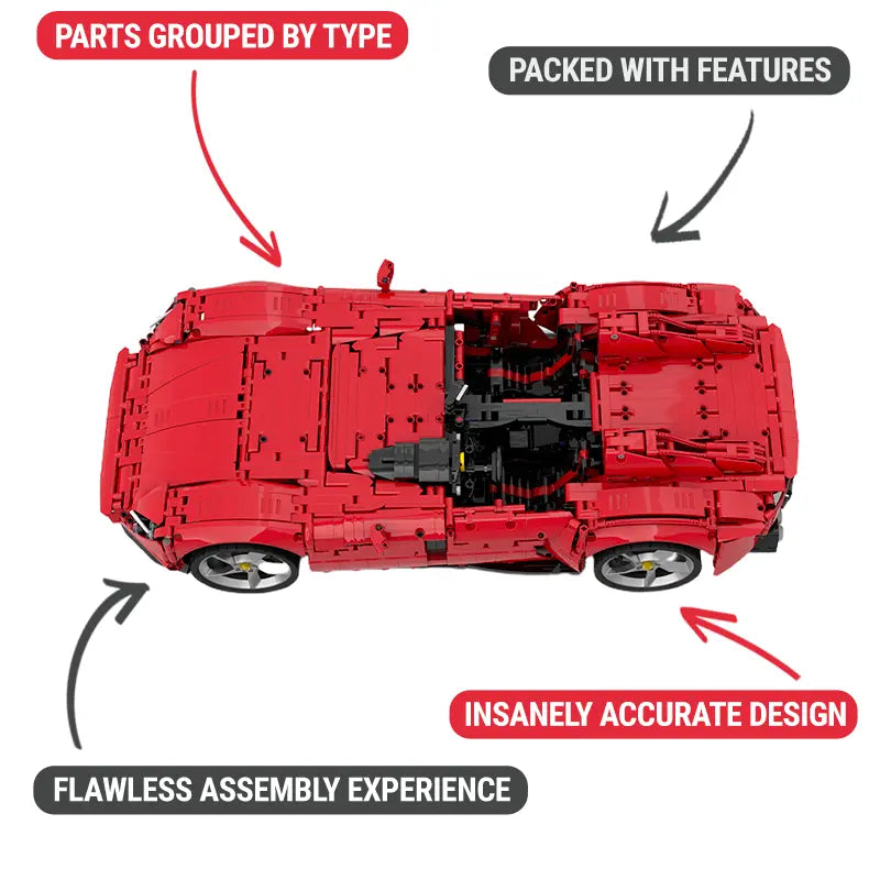 Measuring an impressive 59cm in length and constructed from over 3500 expertly crafted elements, this meticulously detailed masterpiece redefines the art of scale modeling. Its astonishing level of accuracy and craftsmanship is showcased in the functional opening doors, hood, and trunk, revealing a world of finely tuned engineering within.