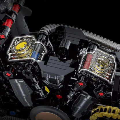 Assemble the engine with rotating pistons for more dynamic play that emphasizes the mechanical sophistication of this motorcycle block model.